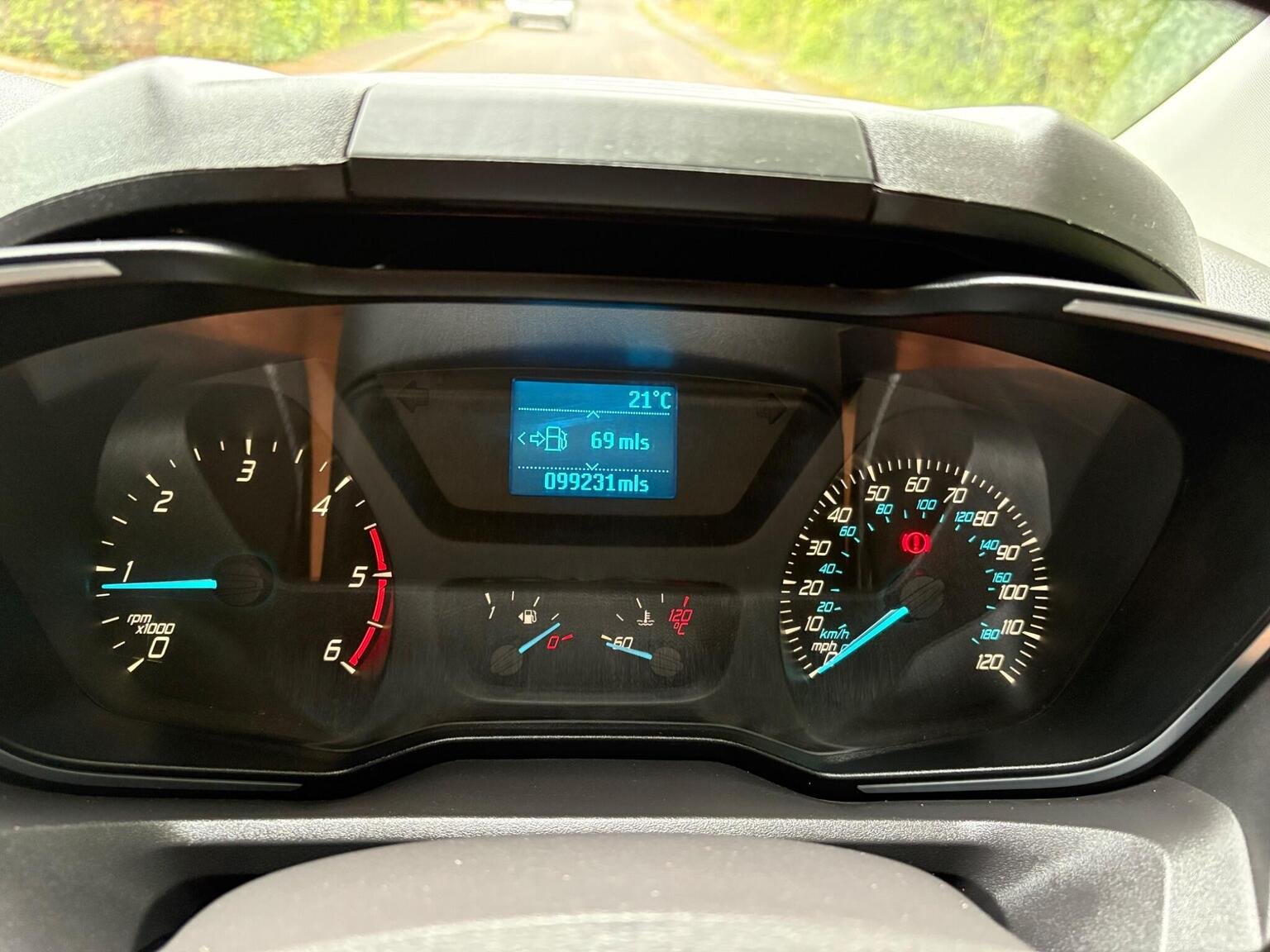 2nd Remote Key Fob, Alloy Wheels - 6.5x16in, Anti-Lock Braking System (ABS) and Emergency Brake Assist (EBA), Auto Wipers with Rain Sensor, Automatic Headlights, Auxiliary Connection Point - 3x60 Amp, Located Under Driver Seat Pedestal , Power Point Socket 2x12V, Body Coloured Bumpers, Bulkhead - Full Width Steel, Unglazed with Load-Through Facility, Complete Rear Trim Board - Half Height, Cruise Control, Deadlocks, Driver Seat Armrest, Driver Seat Height Adjustment, Driver Seat Lumbar Adjustment, Drivers Airbag, Easy Clean Load Floor, Electrically-Operated Front Windows with One-Touch Lowering on Drivers Side, Electronic Brake-Force Distribution (EBD), Electronic Stability Control (ESC) and Roll-Over Mitigation (ROM), Ford DAB Audio System w SYNC/Applink (ICE Pack 9), Ford Eco Mode (Driver Information System), Four Front Speakers, Front Manual Air Conditioning, Head Restraints - Front, Heated Driver and Front Passenger Seats, Hill Start Assist (HSA), Immobiliser - Safeguard Passive Anti-Theft System (PATS), Leather Trimmed Gearshift Knob, Load Area Protection Kit, Outside Temperature Display, Parking Aid Sensor (Front and Rear), Passenger Airbag, Passengers Sliding Side Load Door and Step, Power Assisted Steering (PAS), Power Heated/Power Fold Signal Mirrors, Quickclear Heated Windscreen, Rake and Reach Adjustable Steering Wheel, Remote Audio Controls, Remote Control Central Locking with One Key Fob, Static Cornering Lights and Day Time Running Lights, Steel Spare Wheel, Thatcham Category 1 Alarm, Third Brake Light, Tinted Glass Complete, Twin Facia-Mounted Cup Holder, Tyre Inflator Kit, Upholstery - Charcoal Cloth, Voice Control System